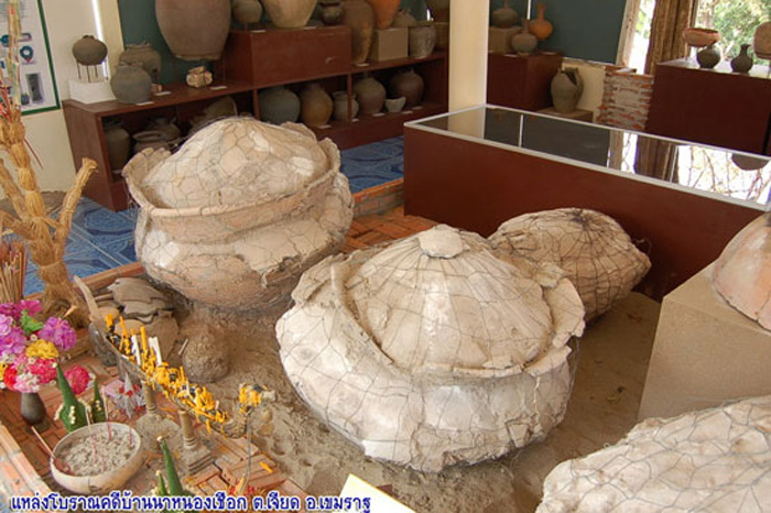 | แหล่งโบราณคดีบ้านนาหนองเชือก ตั้งอยู่ที่ตำบลเจียด อำเภอเขมราฐ จังหวัดอุบลราชธานี เป็นแหล่งโบราณคดีแห่งนี้มีการค้นพบด้วยความบังเอิญเนื่องจากสำนักสงฆ์วัดภูถ้ำพระศิลาทอง ได้มีโครงการก่อสร้างศาลาการเปรียญหลังใหม่ จึงได้นำรถแบ็คโฮไปขุดยังพื้นที่ก่อสร้างปรากฏว่าพบเศษภาชนะดินเผา และเศษกระดูกมนุษย์จำนวนมาก นอกจากนั้นบริเวณใกล้เคียงกันได้พบภาชนะดินเผาขนาดใหญ่ ชาวบ้านจึงได้นำขึ้นมาและเก็บรักษาไว้ในวัดภูถ้ำพระศิลาทอง ต่อมาทางวัดจึงได้สร้างอาคารขึ้นมาเพื่อจัดแสดงโบราณวัตถุเพื่อเป็นแหล่งศึกษาทางประวัติศาสตร์ของชุมชน |