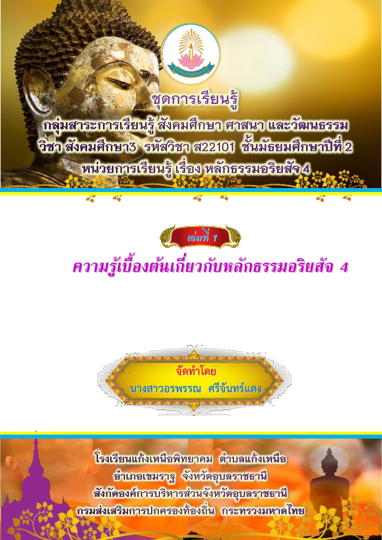 ชื่อผลงาน : การพัฒนาผลสัมฤทธิ์ทางการเรียน และความพึงพอใจของนักเรียน ชั้นมัธยมศึกษาปีที่ 2 ด้วยชุดการเรียนรู้ เรื่อง หลักธรรมอริยสัจ 4 โดยจัดการเรียนรู้แบบบันได 5 ขั้น