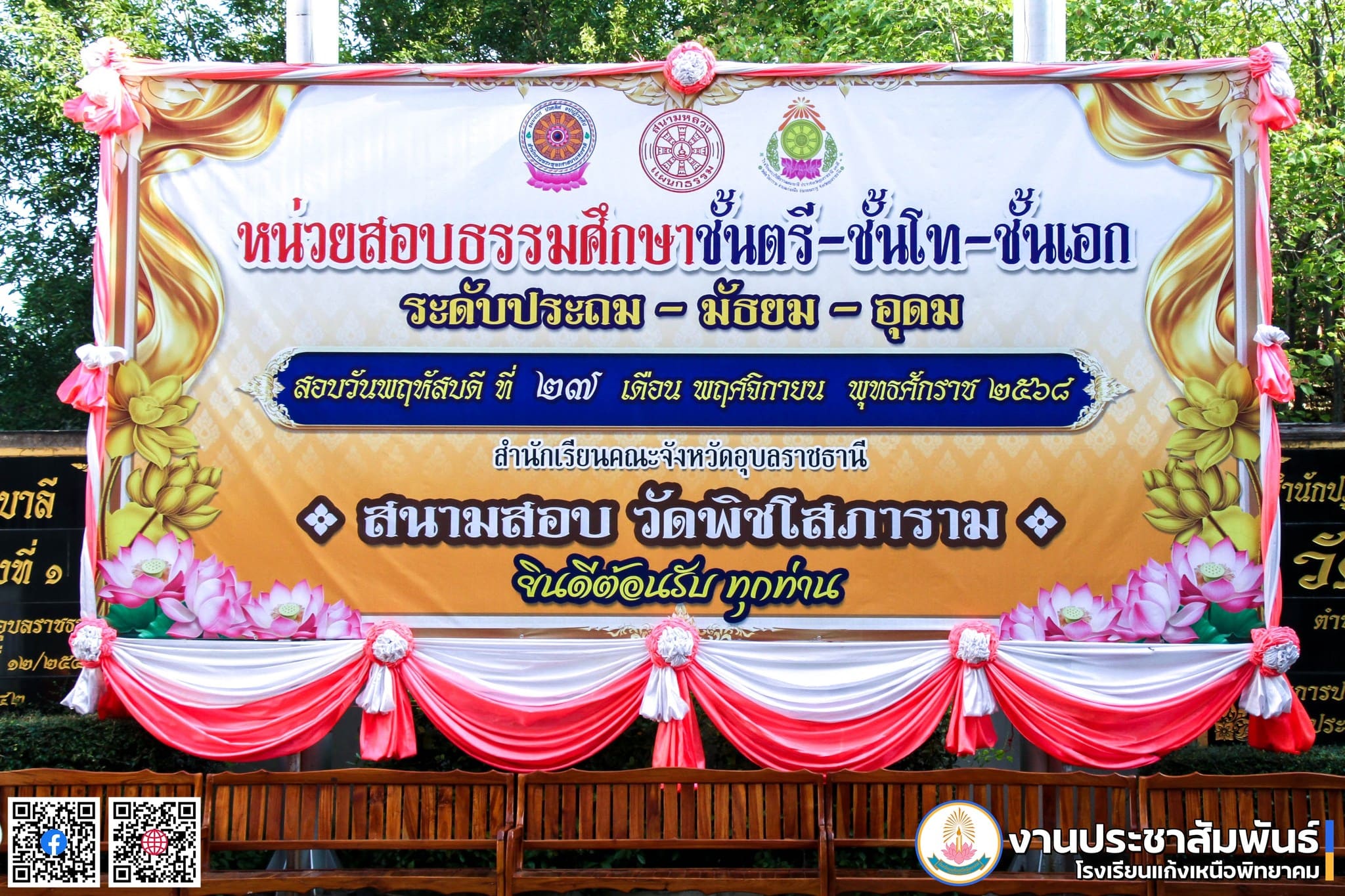 • วันที่ 27 พฤศจิกายน 2568 นางอุไรพร พิพัฒน์พร ผู้อำนวยการสถานศึกษา พร้อมด้วยคณะครู ร่วมปฏิบัติหน้าที่กรรมการกองอำนวยการ, กองงานเลขานุการ และกรรมการกำกับห้องสอบธรรมศึกษา ในการสอบธรรมศึกษาสนามหลวง ประจำปี 2568 ณ หน่วยสอบธรรมศึกษาชั้นตรี-ชั้นโท-ชั้นเอก ระดับประถม-มัธยม และอุดมศึกษา สนามสอบวัดพิชโสภาราม ตำบลแก้งเหนือ อำเภอเขมราฐ จังหวัดอุบลราชธานี